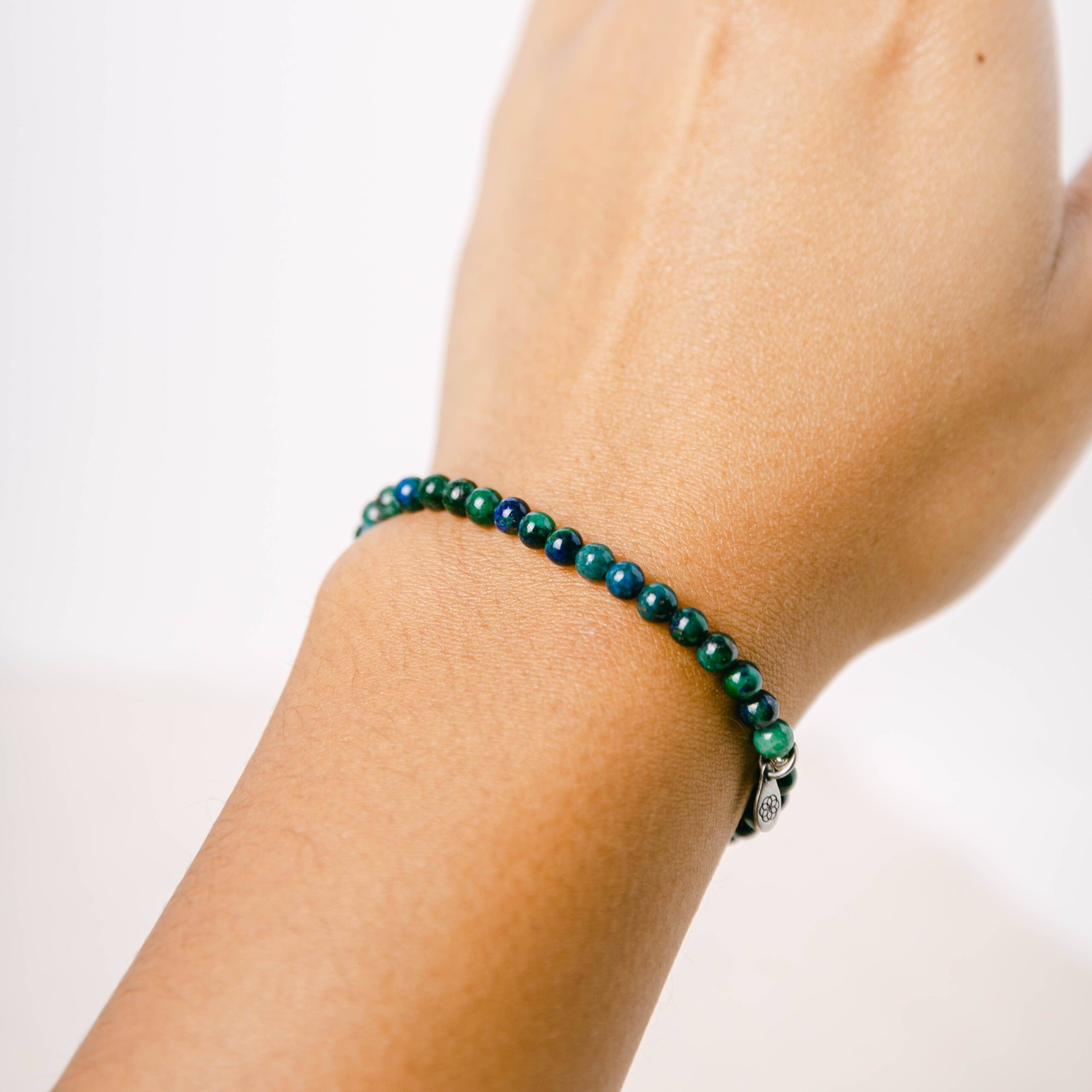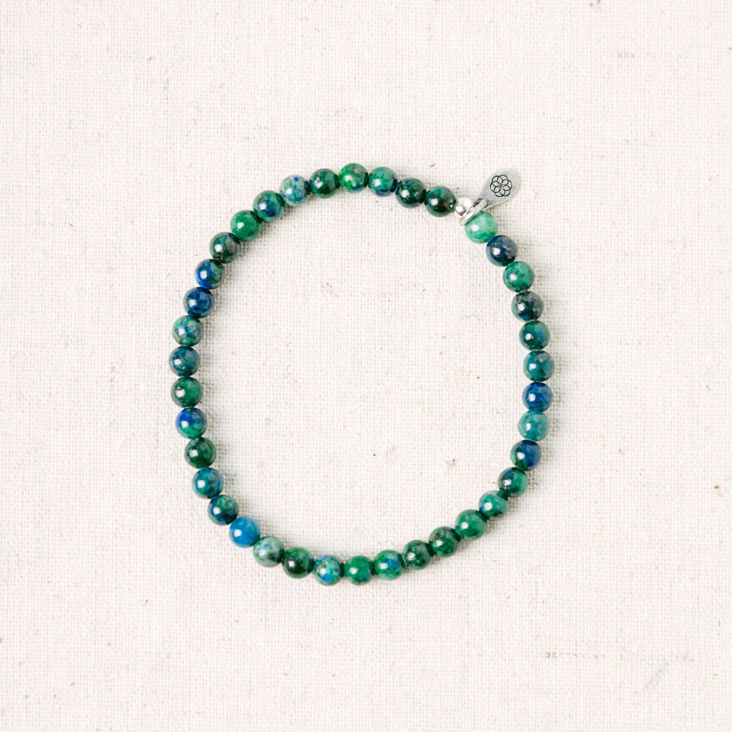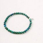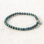 A stone of mighty truth. Chrysocolla stops you from biting down on your lip. It allows the sounds of your soul to rise up like a singing bird and invites you to share proudly in the beauty of your own story. Wearing the Chrysocolla Energy Bracelet. you take the place of being your own greatest teacher. You are able to listen to the depths of your heart. and to communicate with the world at large. The soft and supple aura of the Chrysocolla stone has been a favorite among wise women across the centuries. This is the stone you will often find stashed in a healer’s pocket as it helps to balance out those in a caring role.