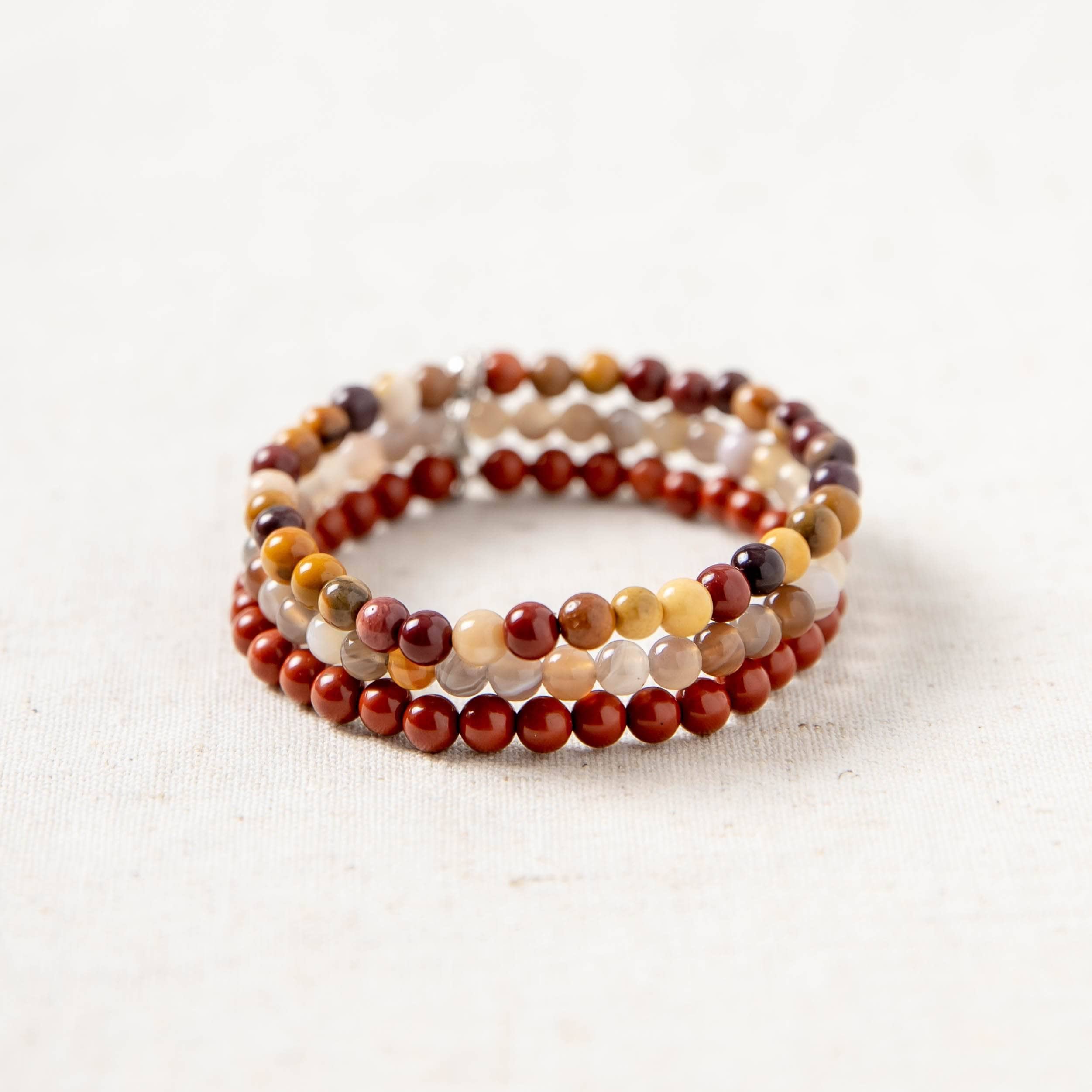 Get clear-headed and strong into that dark night with the Courage & Strength bracelet set. Comprised of comforting Red Jaspar. earthly Botswana Agate. and the spiritual pick-me-up stone of Mookaite Jaspar. this holy trio on your wrist keeps your head high and your heart steady.