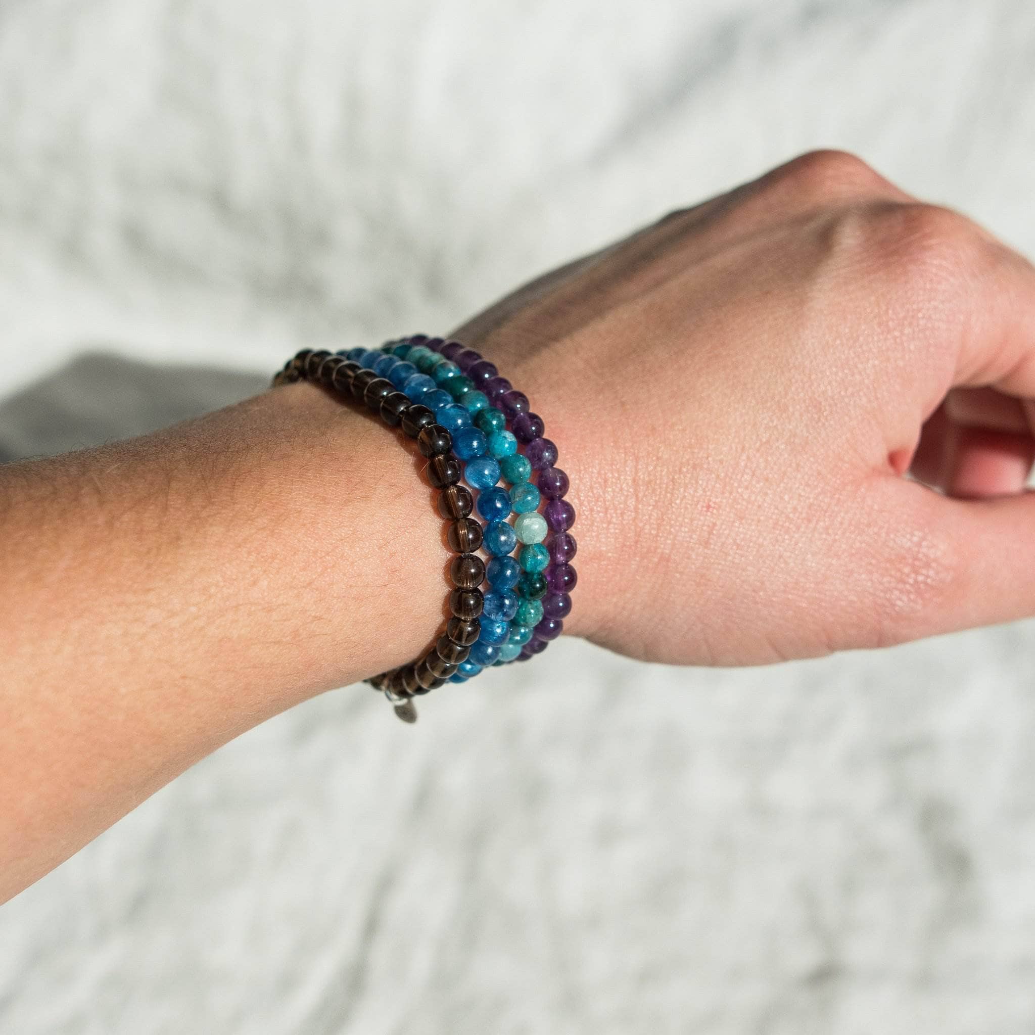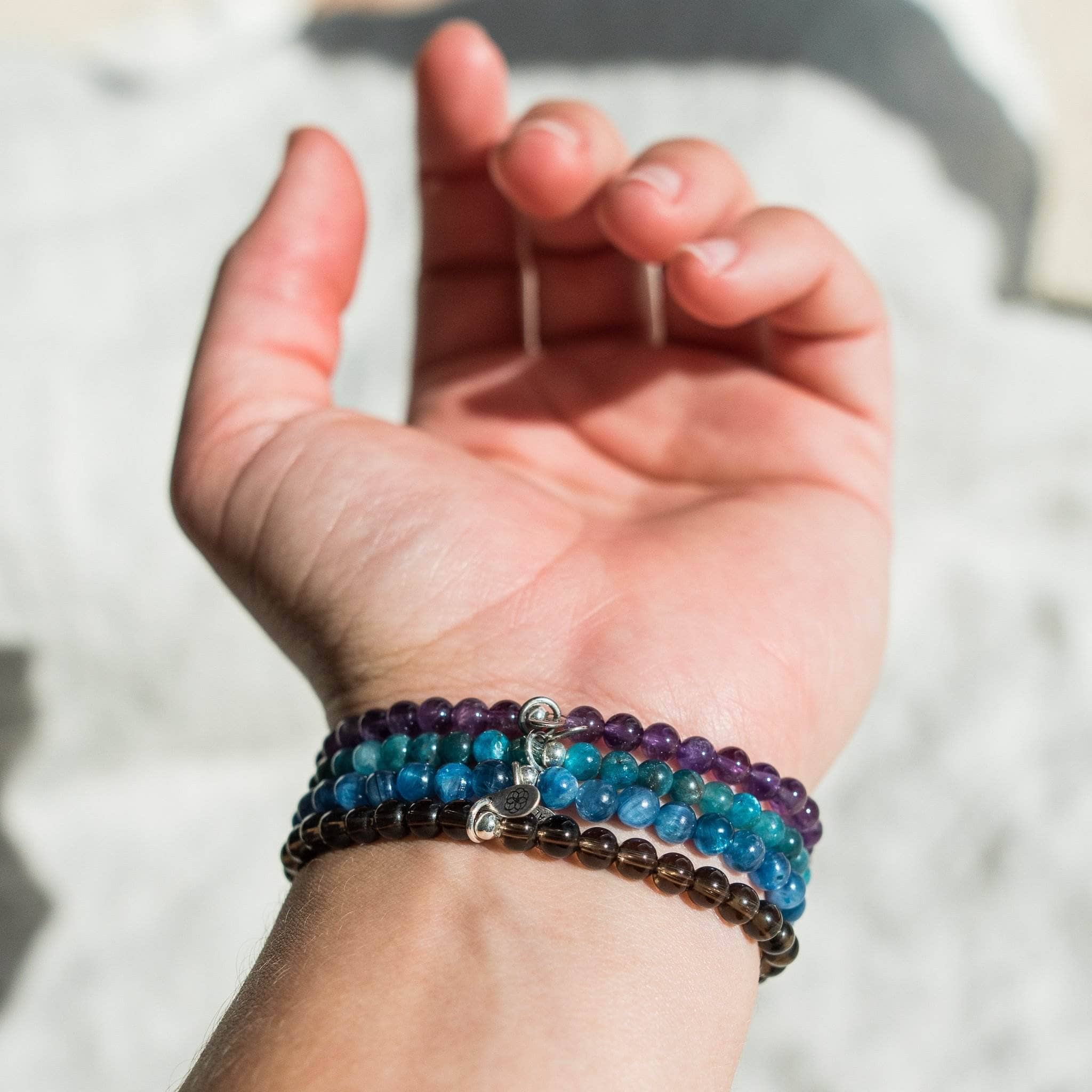 Lift your face to the sun and let go of the burdens in your hand with the gentle healing vibes from this rich compassion gemstone bracelet set. The Forgiveness and Compassion Pack weaves together the healing shades of soft Kyanite. Apatite. Amethyst and Smoky Quartz so you can set your heart space free.