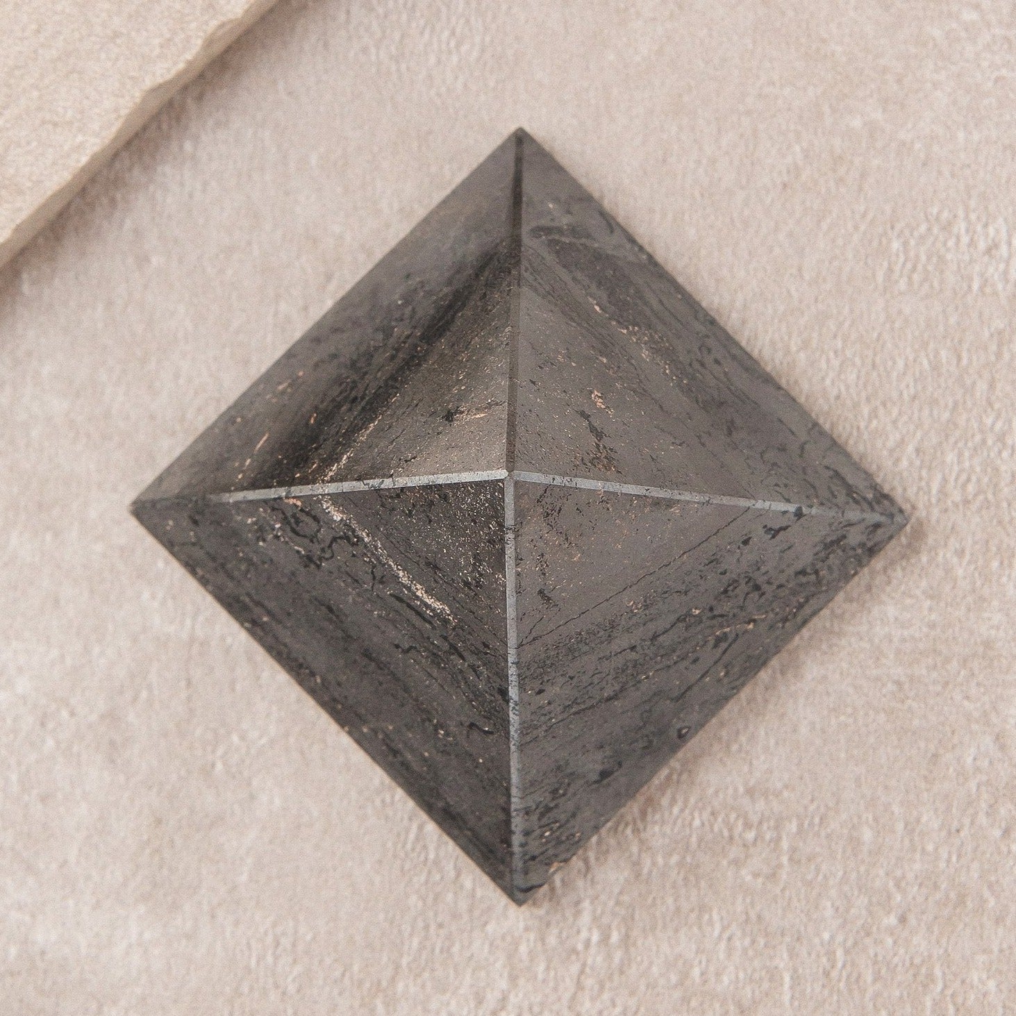 The pyramid is one of the most powerful shapes in the pack when it comes to sacred geometry. With a solid base that stays connected at all corners to the ground and equal sides that rise in harmony to a sky-piercing tip. the Hematite Pyramid reminds us to keep both feet on the ground even when reaching for the stars. The pyramid shape also channels energy from the base and sends it out into the universe. it can also call in energy from the universe and deliver it right down to the very base of your being.