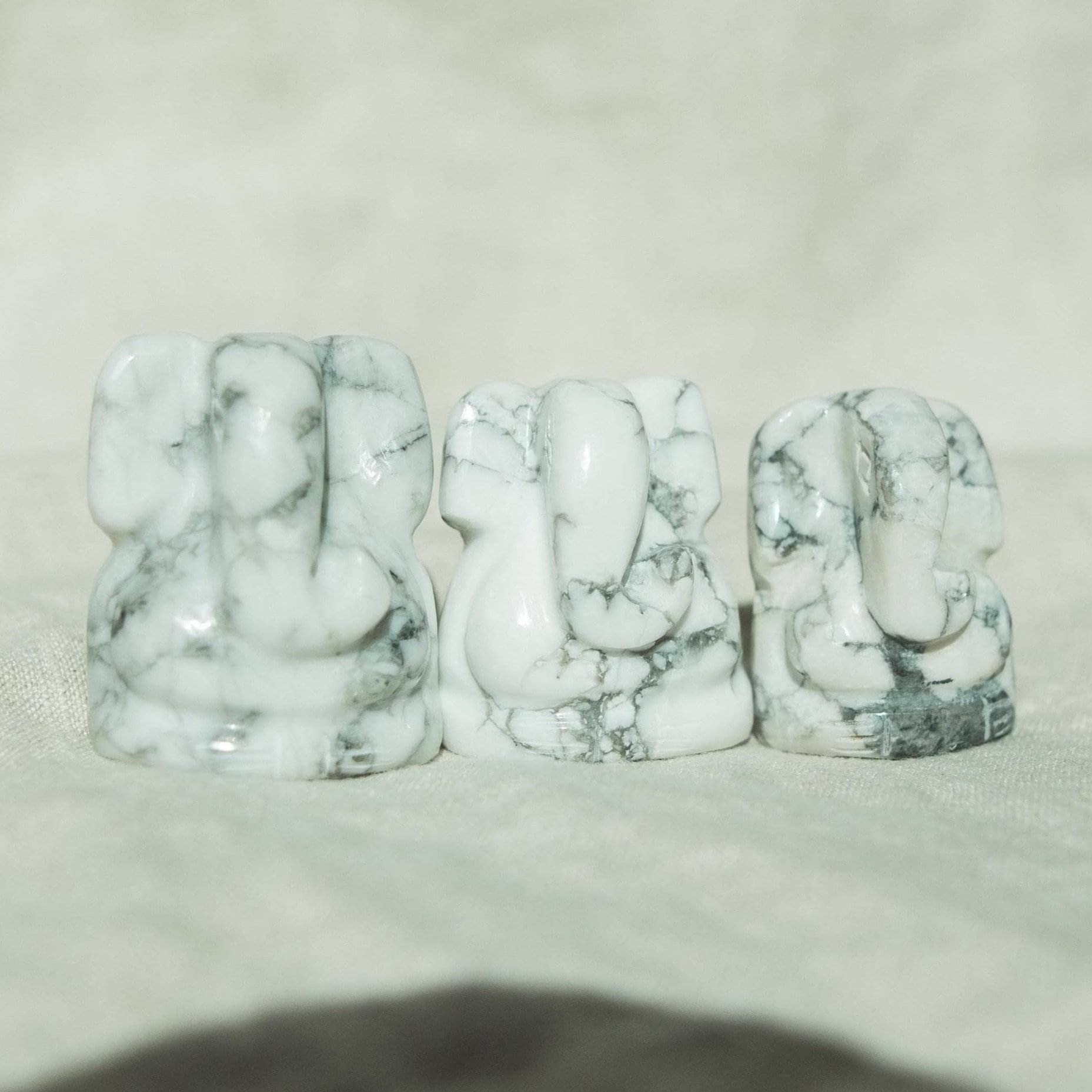 Calm and cooling to the touch. this Howlite Ganesha statue is sure to welcome you into a gentle flow. This pale white stone cracked with tributary like veins works just like a sponge when mopping up bad moods and negative vibes. When combined with the life lessons and wisdom that flows from the elephant god of Lord Ganesha. together they place you in a position of balance. love. and beautiful understanding.