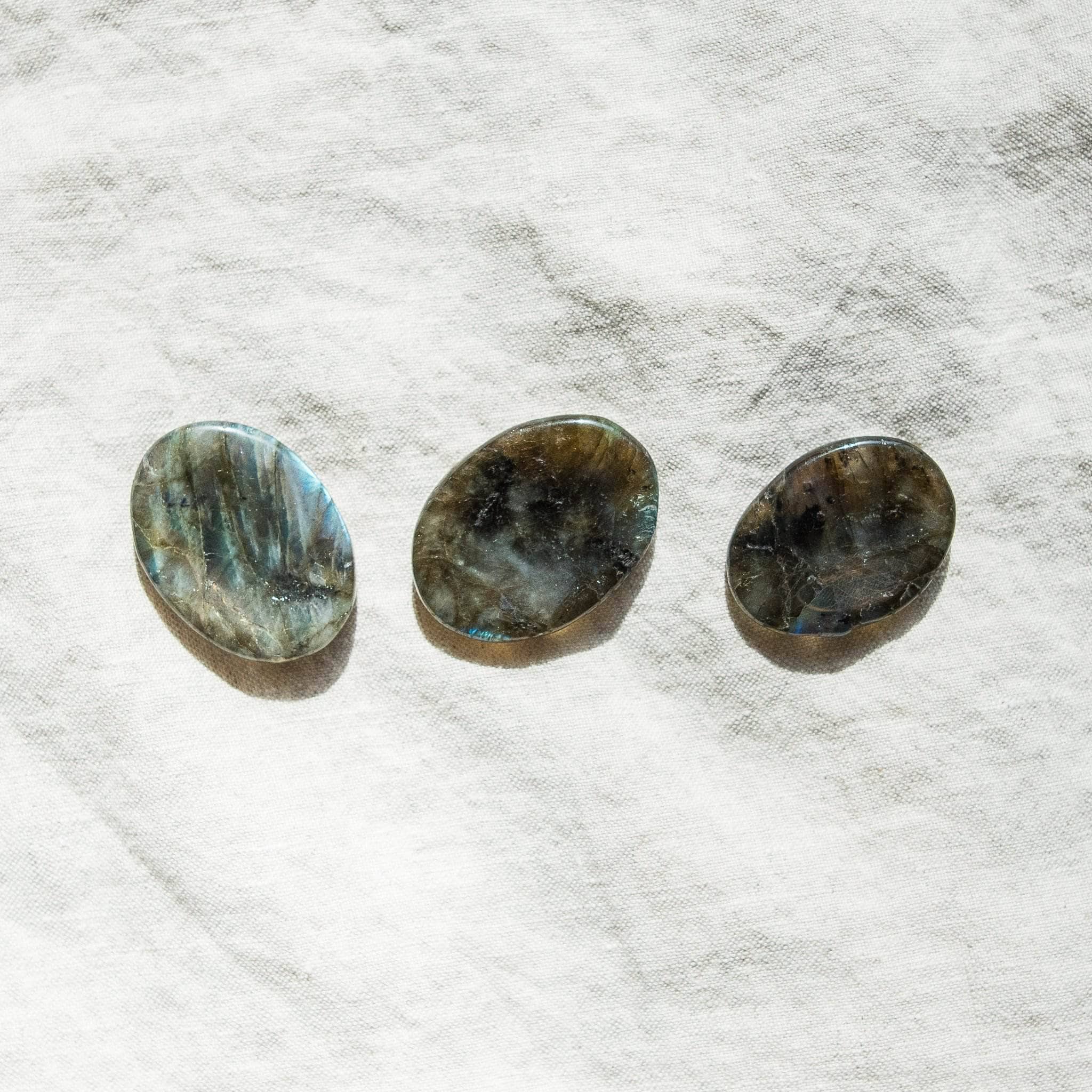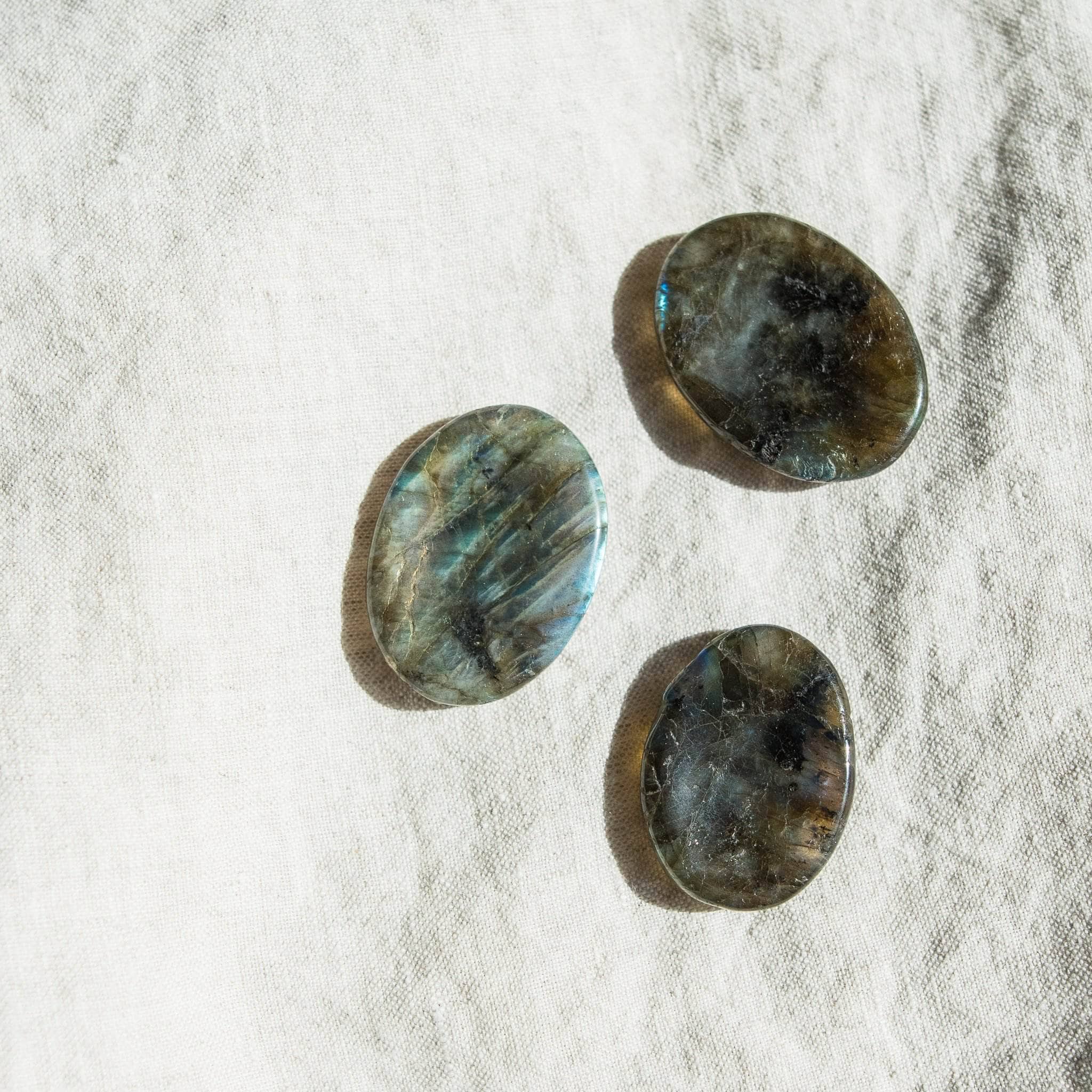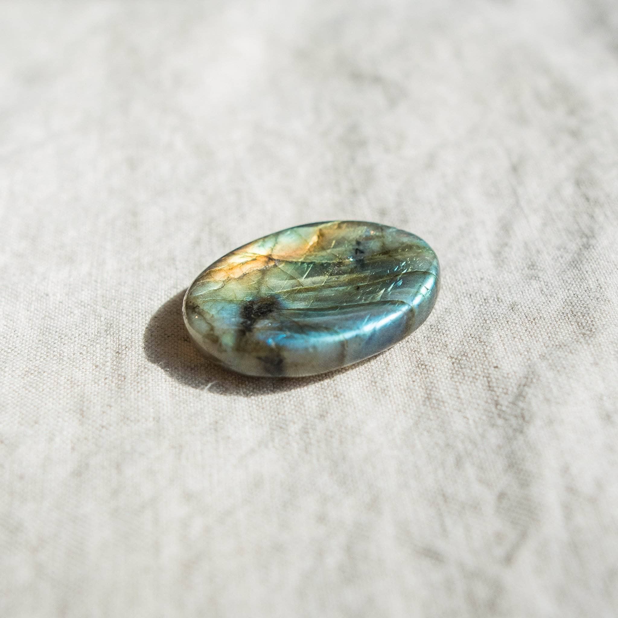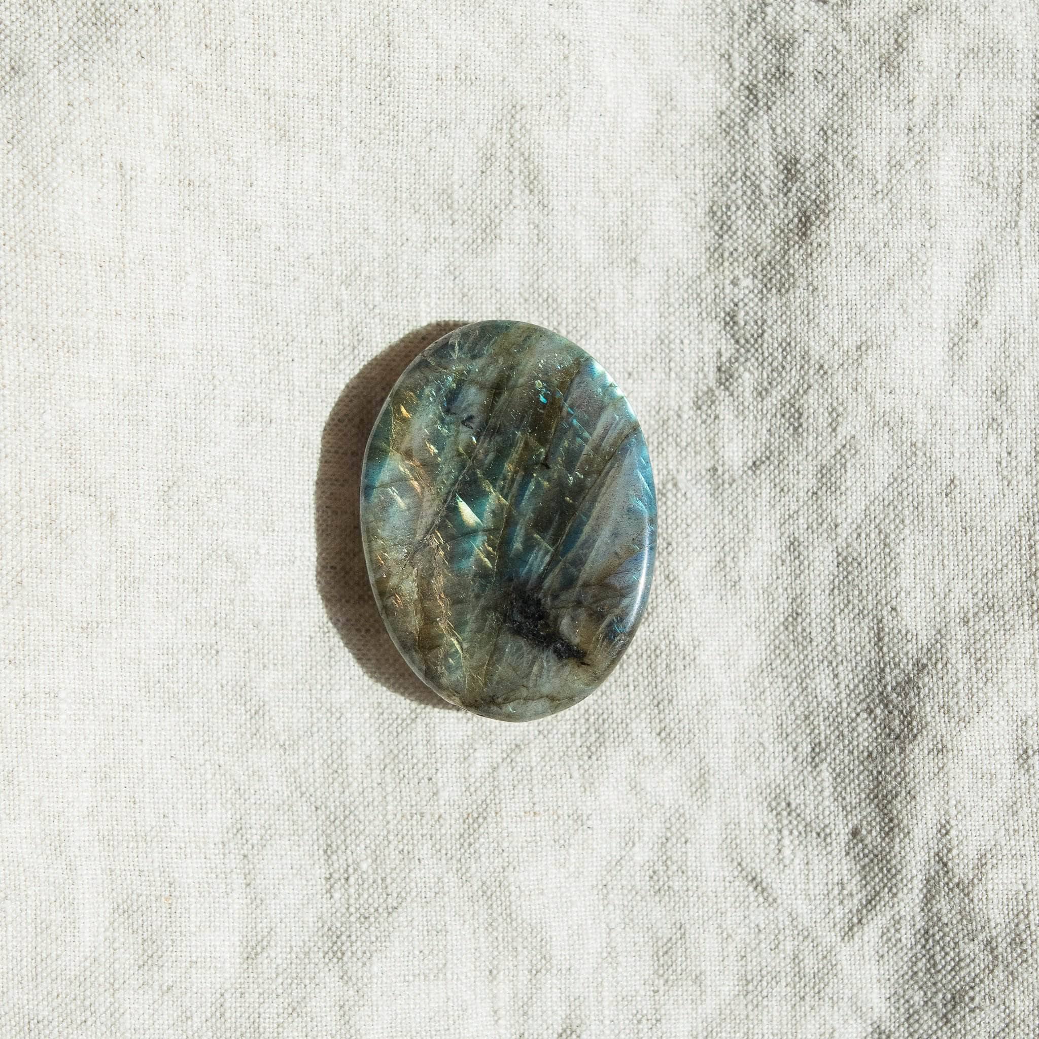 The Labradorite Worry Stone is also tuned into the Feng Shui energy of water. By carrying this palm stone with you or keeping it close by when you feel stuck or tied down to old habits. this gem can bring the sweet flow of serenity. peace. clarity. and a deeper understanding of the self.