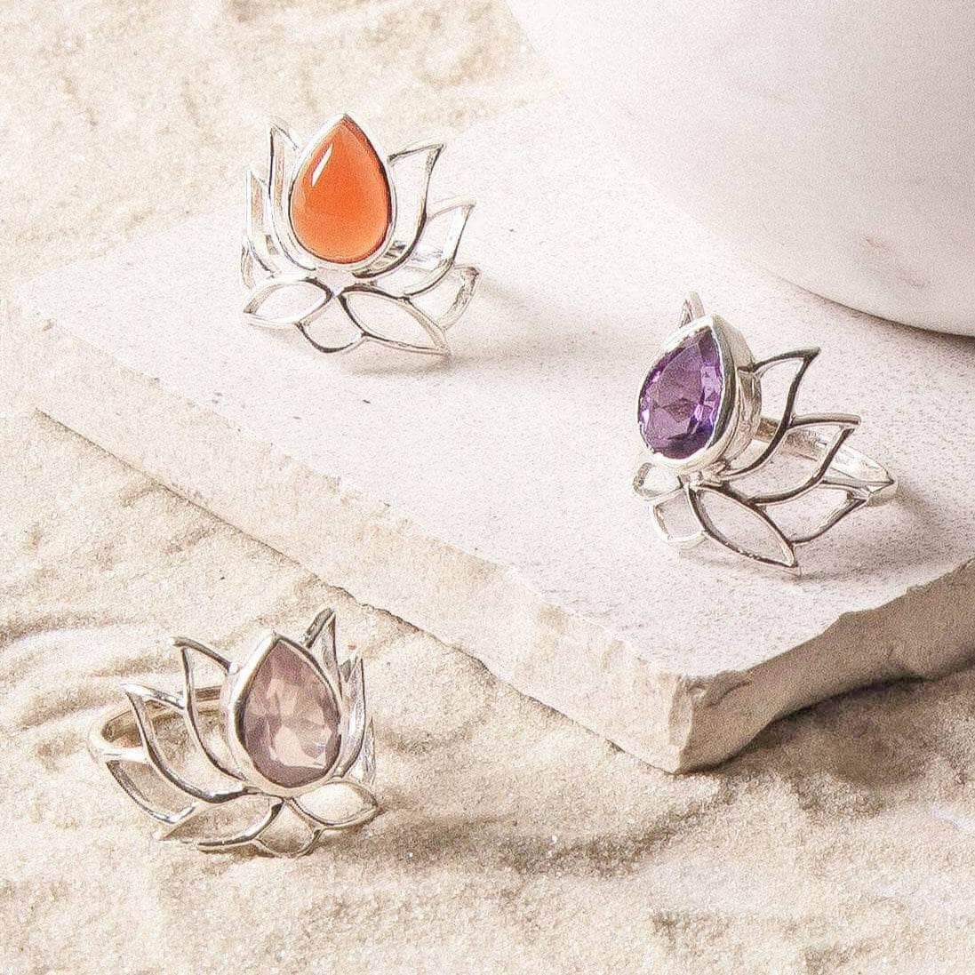 Delicate but powerful. our lotus gemstone rings combine the sacred lotus flower with the powerful values of the gemstones.