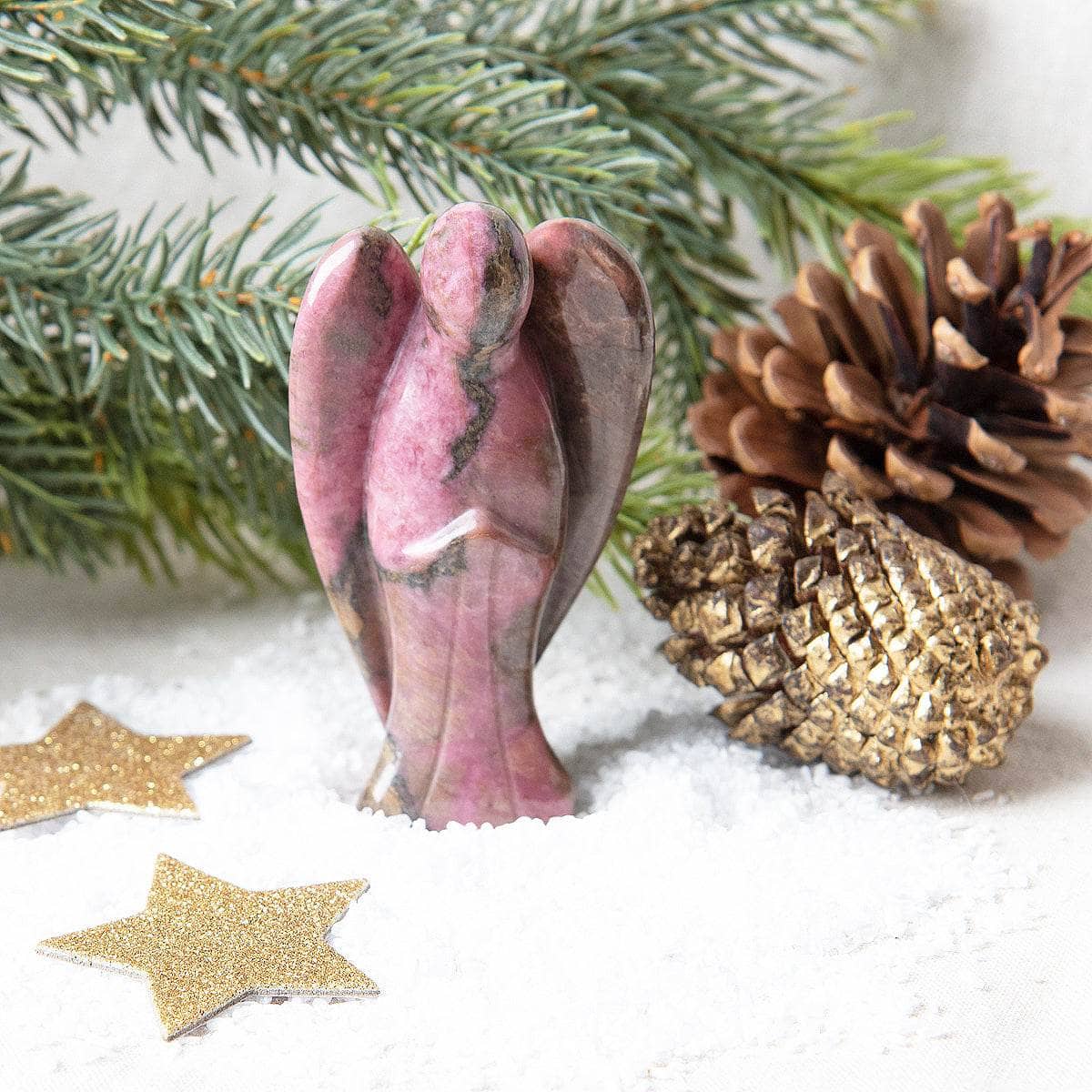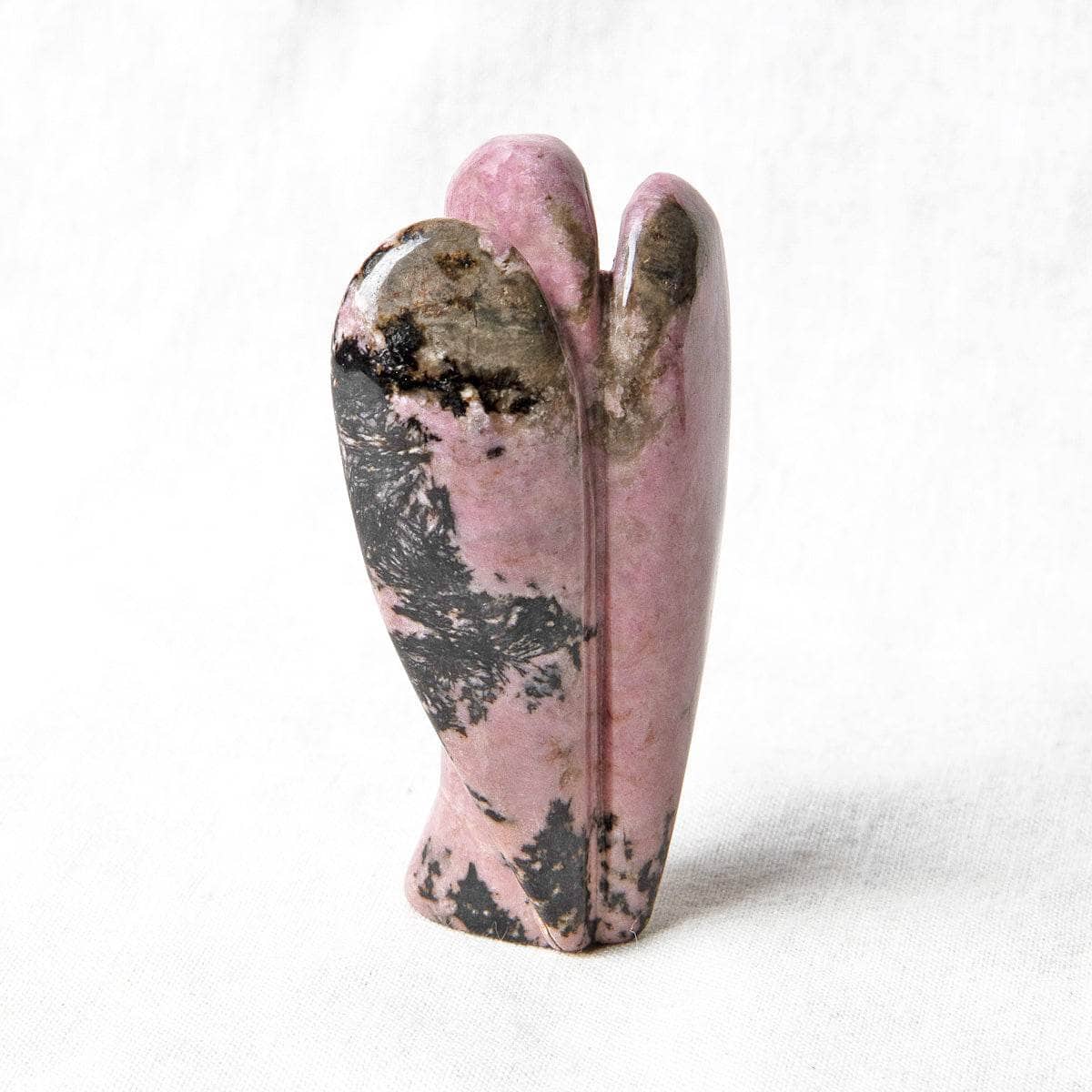 Love and light meld together in the flighty Rhodonite Angel. Carved from Rhodonite. the angel shape is a match made in heaven for this stone. Both angels and this tender gem share themes around heart-centered love. healing old wounds and getting excited about fresh starts. Angels are here to remind us that we are loved. we belong. and that deeper connections are always open to us. Rhodonite backs this up with its beautiful layered energy of strength and softness.