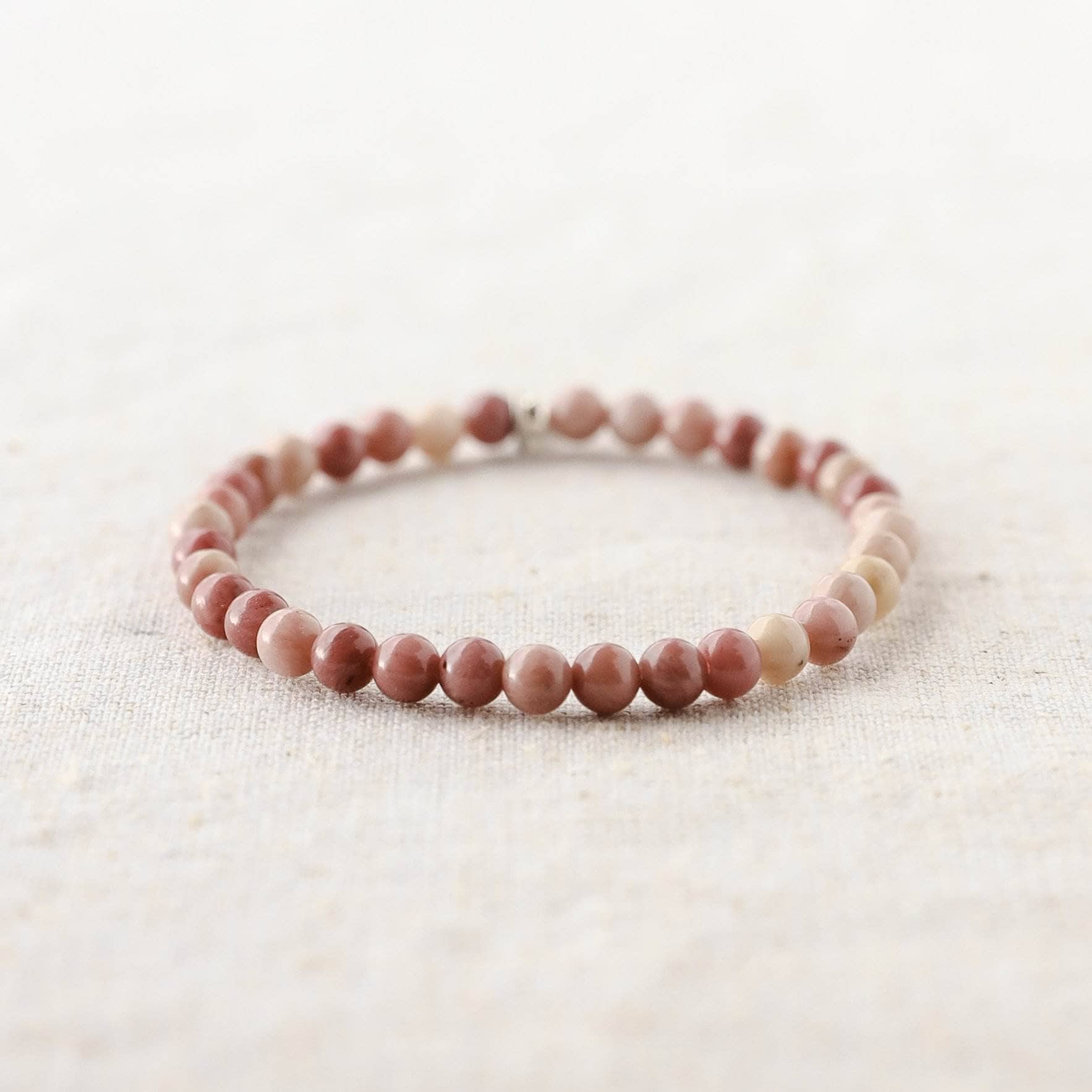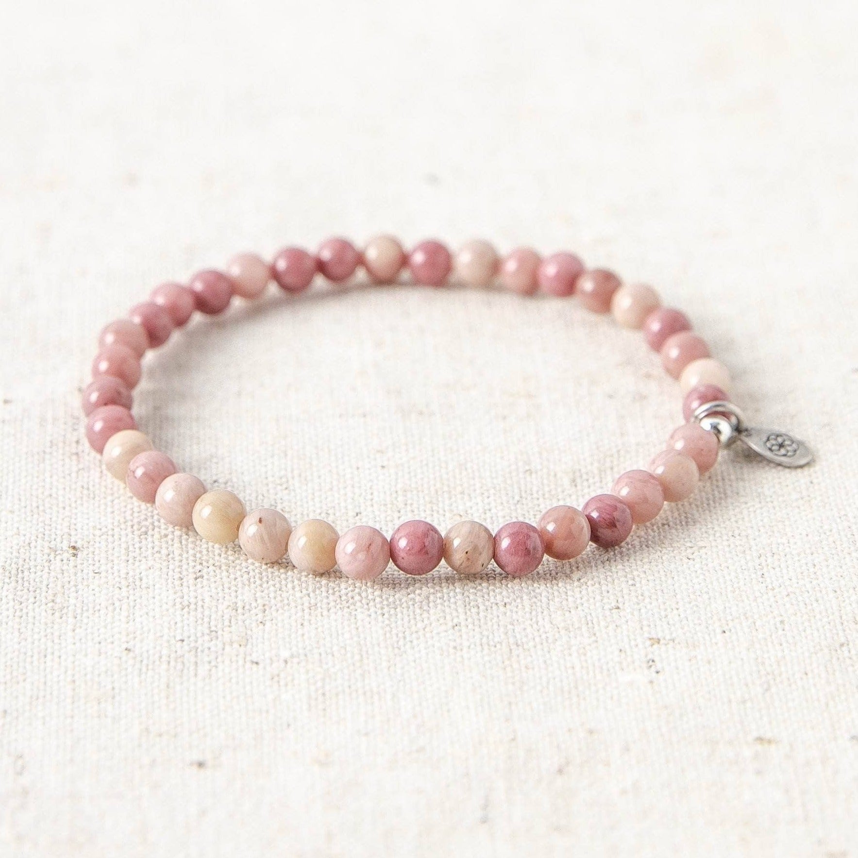 The color of the dawn. rosy pink. and soft cheeked. the Rhodonite Energy Bracelet is a vision of pure relaxation. cozy cashmere days. and the gentle joy that comes with forgiveness and a fullness of heart.