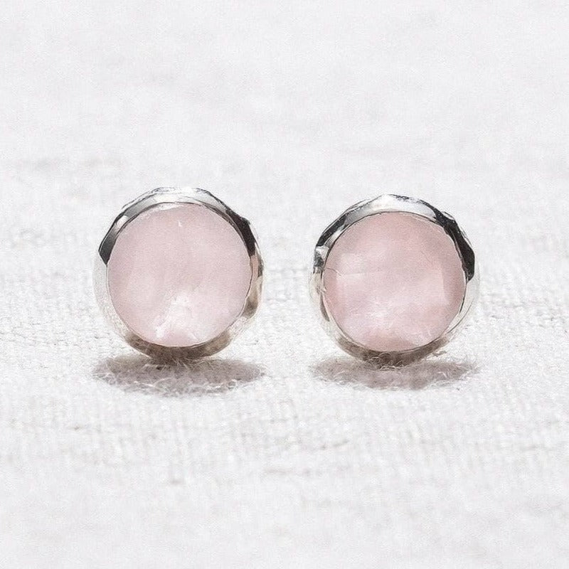 Encased in gleaming silver. these stud earrings also bring another shade of healing. Silver is a metal of precious purity. wisdom. connection. and the bloom of health. Having this metal and stone connected and close to your mind can keep your head clear. your thoughts wise. and your actions deeply loving. Let Rose Quartz and silver sugarcoat your aura.