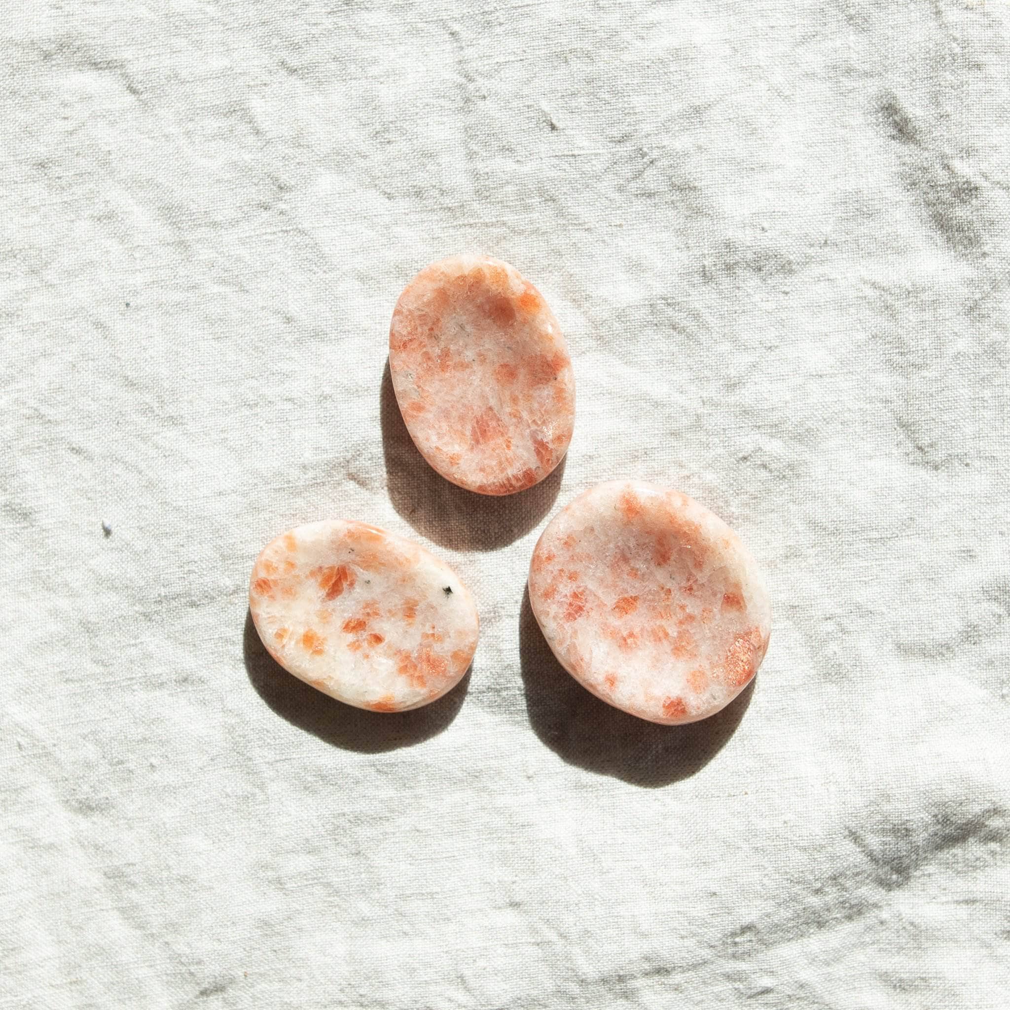 One of our favorite feldspar crystal clusters. this Sunstone Worry Stone has been lovingly polished down into a silky-smooth quartz gemstone complete with thumb indent so it beautifully fits in hand. Worry Stones are perfect ways to embrace the healing energy of crystals. and they bring a moment’s meditation. a centering space. and pure intention to those times when you need an extra dose of energy. a quick aura lift. or a bright chakra clean.