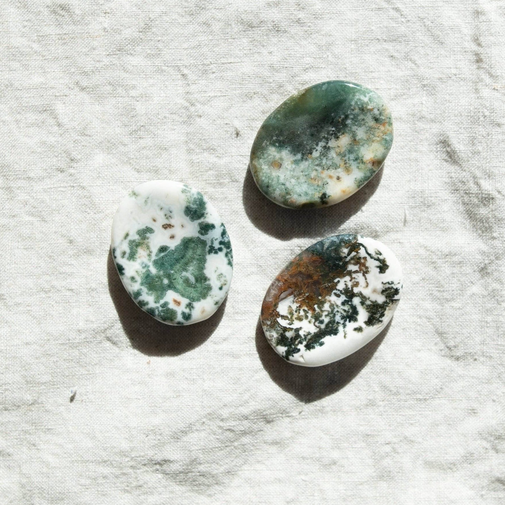 The Tree Agate Worry Stone is a piece of pure nature. These once rough stones were loved by the Greeks who would plant them in their fields for a fine harvest. Dappled in shades of white and green. like light through the trees. these healing tumbled stones are said to bring regeneration and a boost of bright bursting energy. Just like the spring rains. this worry stone also nurtures great internal growth. The Tree Agate invites you to ruminate and rest and look inside for all the answers you already possess.